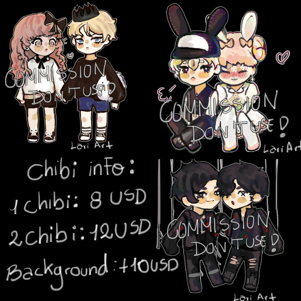45 USD: 2 Fullbodys/2 Halfbody/3 Headshots/ Chibi Fullbody + 1 Fullbody illustration with background 75 USD: 2 Fullbodys/2 Halfbody/3 Headshots/ Chibi Fullbody + 1 Fullbody illustration with background + Extra Outfit